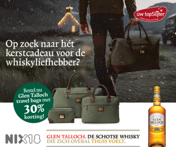 Op de achterzijde van het rug etiket van de Glen Talloch fles vind je nu een unieke actiecode. Daarmee bestel je jouw travel bag met 30% korting via glentallochshop.com